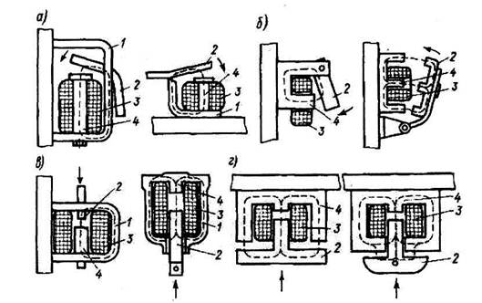 Рис. 9.38. Магнитные системы контакторов: а, б – с поворотным якорем; в, г – с прямоходовым якорем (1 – скоба, 2 – якорь, 3 – катушка, 4 – сердечник); стрелками показано направление движения якорей при включении контакторов
