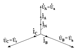 Векторы фазных токов совпадают по направлению с векторами соответствующих фазных напряжений нагрузки. Нейтральный провод с нулевым сопротивлением в схеме с несимметричной нагрузкой выравнивает несимметрию фазных напряжений нагрузки, т.е. с включением данного нейтрального провода фазные напряжения нагрузки становятся одинаковыми.