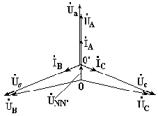 2. Нагрузка несимметричная. RA< RB = RC, но сопротивление нейтрального провода равно нулю: ZN = 0. Напряжение смещения нейтрали