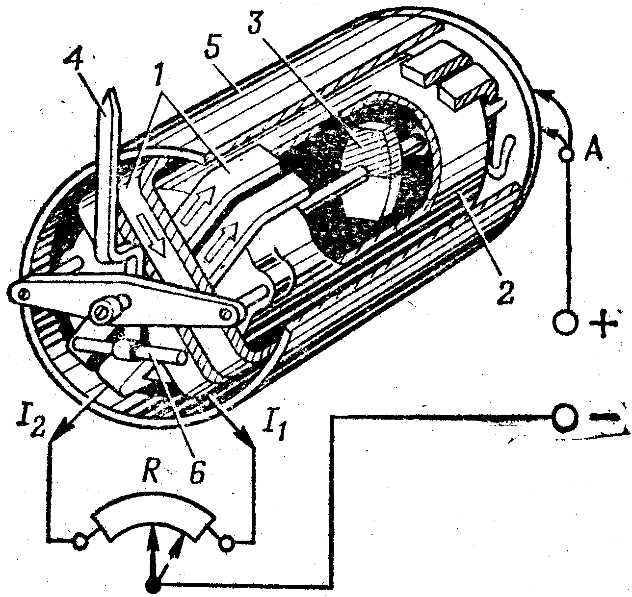Рисунок 1.19 – Устройство магнитоэлектрического логометра с поворотным магнитом 1 - двухсекционные рамки; 2 - каркас; 3 - поворотный магнит; 4 - стрелка с противовесами; 5 - магнитный экран; 6 - установочный магнит