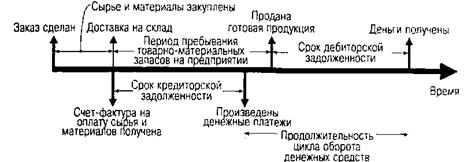 Большинству компаний прежде, чем какие-либо деньги будут получены от продажи выпускаемых ими товаров, приходится затрачивать определенные денежные средства на покрытие произведенных расходов Вследствие этого такие статьи активов фирмы, как товарно-материальные запасы и счета к получению (дебиторская задолженность), как правило, превышают ее обязательства, — такие как счета к оплате (кредиторская задолженность) и аккумулированная задолженность Разница между оборотными активами и текущими обязательствами компании называется оборотным капиталом (working capital) Если потребность фирмы в оборотном капитале носит постоянный, а не сезонный характер, то компания, как правило, старается получить финансирование на долгосрочной основе. Финансирование сезонных потребностей обычно реализуется на основе краткосрочных заимствований, например банковских кредитов. Основной принцип управления оборотным капиталом фирмы заключается в сведении к минимуму вложений в неприбыльные активы, такие как дебиторская задолженность и товарно-материальные запасы, и в максимальном использовании "беспроцентных" кредитов, — предоплата клиентов, начисленная, но не выплаченная заработная плата и кредиторская задолженность. Эти три источника денежных средств являются для фирмы бесплатными, поскольку по ним, как правило, не начисляется явная процентная ставка". Потребность фирмы в оборотном капитале может быть снижена благодаря определенным мероприятиям и процедурам, которые позволяют сократить время между моментом продажи компанией своей продукции и моментом поступления денег на счет. В идеале каждая фирма должна стремиться получить от клиентов аванс за поставляемые товары. Кроме того, компания может сократить свою потребность в оборотном капитале, увеличивая время между приобретением и оплатой необходимых ей ресурсов. Чтобы лучше разобраться во взаимосвязи времени платежа и совершаемых хозяйственных операций, внимательно рассмотрите рис. 3.2.