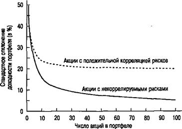 Рис. 11.3. Влияние увеличения числа акций в портфеле на неустойчивость доходности портфеля