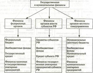 Рис. 3.1. Основные звенья финансовой системы России Государственные финансы каждого уровня включают бюджет, внебюджетные фонды, кредит и финансы-государственных и муниципальных предприятий соответствующего уровня подчиненности (рис. 3.2.). Общность государственных и муниципальных финансов состоит в единстве их доходных источников и в тесном взаимодействии при достижении сбалансированности бюджетов разных уровней. Федеральный бюджет (или бюджет РФ) — важнейшее звено финансовой системы страны. В сущности, это финансовые ресурсы федерального государства. Федеральный бюджет включает доходы и расходы, органически связанные с макроэкономическими показателями, объемом налогов и задачами финансовой политики государства. Федеральный бюджет как финансовый план государства взаимо- язан с финансами предприятий и некоммерческих организаций, Денежными доходами и расходами населения. Финансовый план пРедприятия как баланс доходов и расходов включает раздел «Взаимо- |тношения с бюджетом». В этом разделе отражаются платежи в бюджет ассигнования из бюджета. Финансовые планы бюджетных органи-