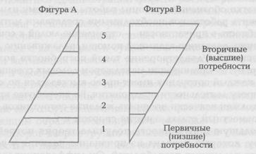 Фигура В в свою очередь показывает качественную сторону потребностей человека. На рисунке видно, что значимость вторичных потребностей несопоставимо выше, чем первичных. Это говорит о том, что современный цивилизованный человек не только хочет обеспечить себя всем необходимым для полноценной жизни (жилье, продукты, одежда, транспорт), но и постоянно стремится повышать свой профессиональный и культурный уровень (учеба, театр, спорт). В каждом человеке потенциально существует непрерывное желание добиваться все новых и новых высот в обществе, удовлетворять все более трудно реализуемые потребности. Именно это стремление к удовлетворению своих все возрастающих потребностей есть главная причина заинтересованности в труде. Различные теории потребностей в основном не противоречат друг другу, а взаимно дополняют друг друга. Они отражают многогранность и нестандартность процесса мотивации и предопределяют необходимость комплексного подхода к решению этой сложной проблемы. В работе менеджера наиболее трудная часть работы — создание условий сотрудникам для удовлетворения потребности высшего порядка. Существуют методы, хорошо показавшие себя в практике менеджмента. Так, социальные потребности можно реализовать, предоставляя сотрудникам работу, которая способствует деловому общению. Необходимо создавать в коллективе обстановку единой команды, работающей на конечный результат. Рекомендуется проведение регулярных совещаний персонала по обсуждению актуальных вопросов деятельности предприятия. Следует создавать благоприятные условия для проявления работниками социальной активности, например их участия в благотворительной деятельности предприятия. Наконец, целесообразно сохранять в коллективе неформальные группы и их лидеров, если это не препятствует выполнению производственных заданий. Примерами таких неформальных групп могут быть члены экологических организаций, болельщики спортивных команд, филателисты, любители классической или популярной музыки. Потребность в уважении реализуется путем предоставления сотрудникам более содержательной, интересной работы, если для этого имеются соответствующие возможности. Менеджеру следует обеспечить обратную связь с подчиненными в соответствии с достигнутыми результатами работы, что позволит добиться объективной оценки их усилий. Рекомендуется привлечение сотрудников к определению целей предприятия и выработке необходимых решений. В этом случае персонал компании будет чувствовать свою-причастность к общему делу. Менеджеру можно делегировать подчиненным дополнительные права и полномочия, для того чтобы сотрудники увеличивали свой профессиональный опыт. Наиболее способных работников, которые показали реальные успехи в труде, следует продвигать вверх по служебной лестнице. Наконец, для повышения компетентности сотрудников менеджер должен организовать постоянный процесс переподготовки и повышения квалификации персонала. Наиболее трудно реализуемая задача для менеджера — это удовлетворение потребностей людей в самореализации (самовыражении). Трудности здесь проистекают от восприятия человека как неповторимой и одновременно сложной личности. Основными направлениями реализации таких потребностей являются: обеспечение необходимых условий для профе