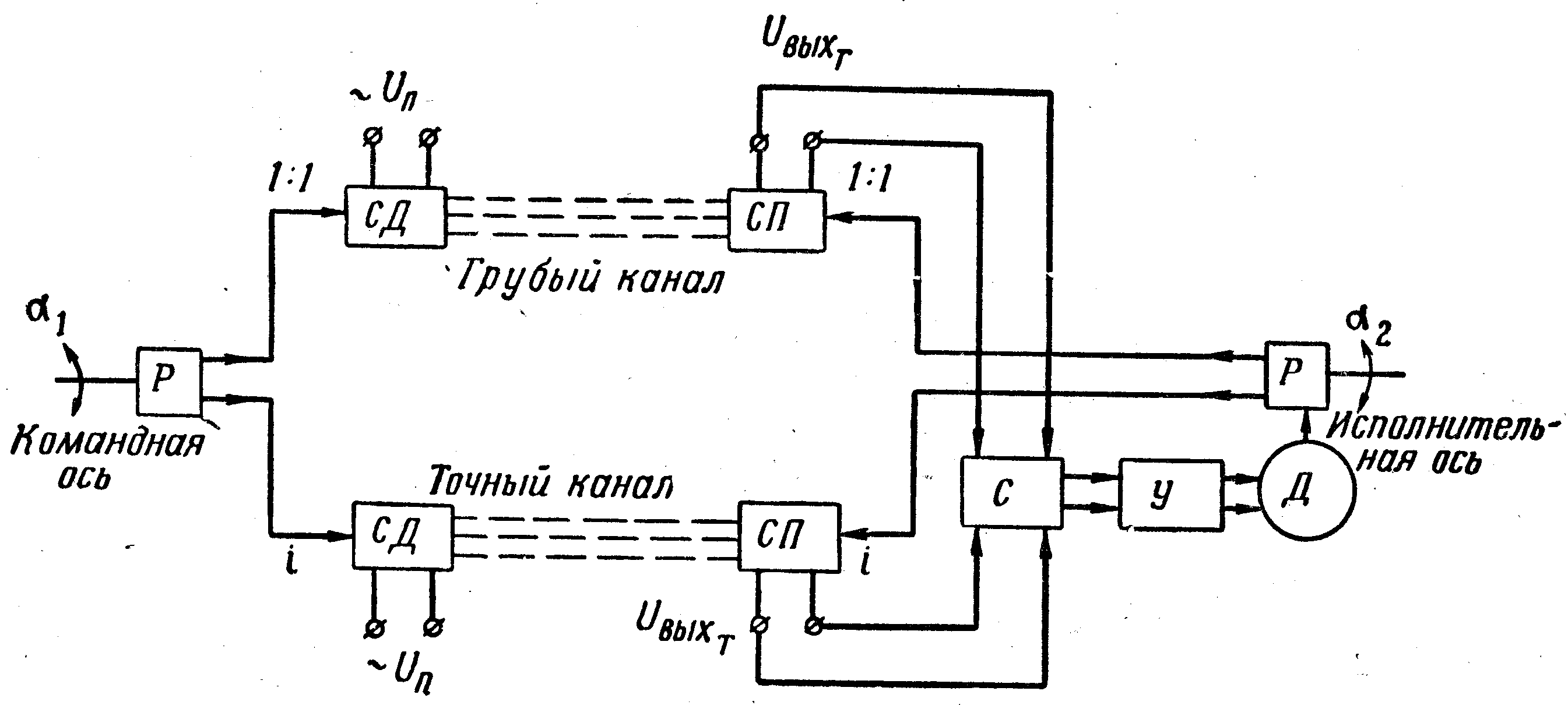 Чувствительность k сельсинных устройств, применяемых в авиационном оборудовании, как уже отмечалось, составляет примерно 1 В/град. При такой чувствительности сельсинов, выполняющих роль измерительного органа в следящей системе, осуществить высокую степень точности системы не представляется возможным. Действительно, в ряде случаев допустимая величина угла рассогласования в следящей системе меньше собственной ошибки сельсинов. В этом случае выходное напряжение U вых0 сельсин-приемника, соответствующее допустимым в следящей системе углам рассогласования, настолько мало, что не вызывает реакции со стороны исполнительного устройства системы. Поэтому возникает необходимость каким-то образом повысить величину напряжения U вых0, соответствующего малым углам рассогласования в системы, т. е. повысить чувствительность сельсинной схемы и тем самым повысить томность работы следящей системы в целом. На практике эта задача решается путем применения повышающем передачи (редуктора) между командной осью и ротором СД и соответственно между исполнительной осью и ротором СП. В этом случае следящая система имеет две сельсинные схемы, образующие два канала измерения рассогласования в системе: грубый и точный каналы, каждый из которых включает в себя сельсин-датчик и сельсин-приемник (рис. 2.17).