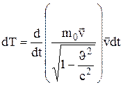 Найдем кинетическую энергию релятивистской частицы (материальной точки). Известно, что приращение кинетической энергии материальной точки на элементарном перемещении равно работе силы на этом перемещении: dT=dA или Учитывая, что
