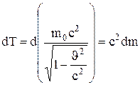 т.е. приращение кинетической энергии частицыпропорционально приращению ее массы. Так как кинетическая энергия покоящейся частицыравна нулю, а ее масса равна массе покоя m0, то, проинтегрировав (7.22) получим