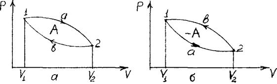 Работа, совершаемая газом при адиабатическом расширении 1-2 (определяется заштрихованной площадью, выполненной на рис. 61), меньше, чем при изотермическом. Это объясняется тем, что при адиабатическом расширении происходит охлаждение газа, тогда как при изотермическом - температура поддерживается постоянной за счет притока извне эквивалентного количества теплоты. Рассмотренные изохорный, изобарный, изотермический и адиабатический процессы имеют общую особенность - они происходят при постоянной теплоемкости. В первых двух процессах теплоемкости соответственно равны Сv и Сp, в изотермическом процессе (dT=0) теплоемкость равна ±¥, в адиабатическом (dQ=0) теплоемкость равна нулю. Процесс, в котором теплоемкость остается постоянной, называется политропным. Исходя из первого начала термодинамики при условии постоянства теплоемкости (C=const), можно вывести уравнение политропы: pVn=const, (2.25) 2.7. Круговой процесс (цикл). Круговым процессом (или циклом) называется процесс, при котором система, пройдя через ряд состояний, возвращается в исходное. На диаграмме процессов цикл изображается замкнутой кривой (рис. 62). Цикл, совершаемый идеальным газом, можно разбить на процессы расширения (1-2) и сжатия (2-1) газа. Работа расширения (определяется площадью фигуры 1а2V2V1) положительна (dV > 0), работа сжатия (определяется площадью фигуры 2blV1V22) отрицательна (dV < 0). Следовательно, работа, совершаемая газом за цикл, определяется площадью, охватываемой замкнутой кривой. Если за цикл совершается положительная работа