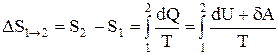 Функция состояния, дифференциалом которой является Из формулы (2.27) следует, что для обратимых процессов изменение DS=0. (2.29) В термодинамике доказывается, что энтропия системы, совершающей необратимый цикл, возрастает: DS>0. (2.30) Выражения (2.29) и (2.30) относятся только к замкнутым системам, если же система обменивается теплотой с внешней средой, то ее энтропия может вести себя любым образом. Соотношения (2.29) и (2.30) можно представить в виде неравенства Клаузиуса DS т.е. энтропия замкнутой системы может либо возрастать (в случае необратимых процессов), либо оставаться постоянной (в случае обратимых процессов). Если система совершает равновесный переход из состояния 1 в состояние 2, то, согласно (2.28), изменение энтропии