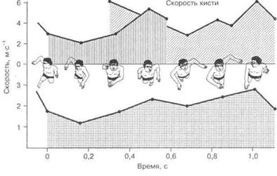 Рис. 1.12 Влияние угла атаки на направление перемещения воды Рис. 1.13 Динамика скорости движения кисти при плавании кролем на груди Скорость правой кисти в момент захвата составляет 1,8 м-с-1, в фазе подтягивания — около 4 м-с-1, при переходе к отталкиванию несколько снижается — 3,4 м-с-1, а при его завершении достигает б м-с-1. Динамика скорости плавания при этом почти совпадает с динамикой скорости движения кисти, что, впрочем, характерно и для других способов плавания. Скорость движения руки во время каждого основного изменения направления движения падает. Вероятно, существует оптимальная зависимость между скоростью движения руки и углом атаки в каж- дой фазе гребка. Несомненно и наличие оптимума скорости движения руки в каждой фазе гребка. При сопоставлении рис. 1.13 и 1.14 можно отметить тесную связь между скоростью движения кисти и силой тяги в различные фазы гребка. Значение захвата. Захват — фаза гребка, в которой начинает развиваться движущая сила. Он не должен начинаться до того, как рука пройдет около трети длины гребка, и до прошествия трети его общего времени. При этом энергичное усилие не должно прилагаться, пока локти не окажутся выше кистей, а кисти не будут обращены назад. Основными движениями рук при выполнении гребка являются — в стороны, вниз, вовнутрь и вверх (табл. 1.1). Движения рук в стороны. С этого движения начинается гребок при плавании брассом и баттерфляем (рис. 1.15). Оно является не продвигающим, а подготовительным к выполнению захвата. При плавании баттерфляем сразу после входа рук в воду, а при плавании брассом перед их выведением вперед руки разводят в стороны по криволинейной траектории до тех пор, пока кисти не окажутся шире плеч в положении благоприятном для начала захвата. В начале этого движения ладони повернуты вниз, угол атаки близок к 0°, пока кисти не займут благоприятного для развития движущей силы положения. По мере его выполнения ладони разворачиваются наружу и назад, а скорость движения кистей падает. Движение рук вниз характерно для плавания кролем на груди и на спине (рис. 1.16). Оно предшествует и сопутствует захвату и также, как движение в стороны при плавании брассом и баттерфляем, не является продвигающим. После входа в воду рука двигается вниз по криволинейной траектории. Кисти при этом согнуты, а по мере приближения к захвату слегка разворачива- ГЛАВА 1