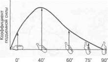 Рис. 4.8 Угол атаки кисти постоянно изменяется при гребке для достижения максимальной подъемной силы Рис. 4.9 Коэффициент подъемной силы при различном положении кисти пловца (данные Шлейхауфа) который установил, что продвиже подъемной силы и силы лобового сопротивления, а их постоянным взаимодействием. Шлейхауф создал точную копию кисти руки из пластичной смолы, которую установили в гидроканале с изменяемой скоростью водного потока. «Кисть» была установлена на контрольном стержне, позволяющем измерять как подъемную силу, так и силу лобового сопротивления при различных углах атаки и скорости потока. Шлейхауф установил, что коэффициент подъемной силы кисти (его отражает зависимость подъемной силы от угла атаки) на 20 % меньше, чем крыла самолета, что объясняется менее эффективной формой кисти. Согласно Шлейхау-фу, подъемная сила, действующая на кисть пловца, увеличивается с увеличением угла атаки до 40°, а при дальнейшем увеличении угла атаки снижается (рис. 4.9). Лобовое сопротивление зависит также от угла атаки и возрастает с его увеличением до 90°. Причем, согласно Шлейхауфу, чему отдать преимущество — подъемной силе или силе лобового сопротивления в продвижении пловца — зависит от угла атаки в тот или иной момент гребка. При угле менее 45° преимущественную роль играет подъемная сила, а при большем — сила лобового сопротивления. Используя кинокамеру, Шлейхауф снимал сильнейших пловцов непосредственно снизу под прямым утлом к направлению их движения. При этом на кисти обеих рук спортсме-