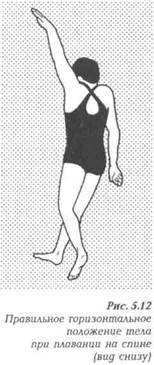 Благоприятно почти горизонтальное положение тела с небольшим прогибом в области талии (см. рис. 5.7), препятствующим «выскакиванию» на поверхность воды бедра при движении ноги вверх. Затылок должен находиться ниже уровня воды, уши на его линии, подбородок слегка приподнят, взгляд пловца устремлен назад и вверх.
