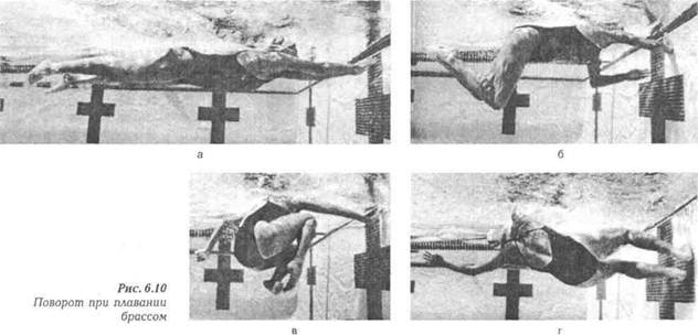 направлении стенки бассейна, коснуться ее кончиками пальцев. Как и при повороте, обе руки должны коснуться стенки одновременно. Необходимо отрабатывать синхронизацию движений так, чтобы всегда финишировать при окончании ударного движения ногами, а не гребка. В этом случае не приходится стремительно делать дополнительное движение руками возле стенки. Дополнительные варианты поворотов, которые должны быть освоены специализирующимися в комплексном плавании, — повороты при переходе с баттерфляя на кроль на спине, с кроля на спине — на брасс и с брасса на кроль на груди. Существует много вариантов выполнения этих поворотов, однако ограничимся наиболее «традиционными». Поворот при переходе с баттерфляя на кроль на спине. При завершении отрезка баттерфляем при повороте следует руководствоваться правилами для этого способа плавания, т.е. плечи и руки должны быть параллельны стенке бассейна, возле которой выполняется поворот. После касания стенки обеими руками, кисть «ведущей» руки покидает ее первой, опускается вниз к бедру и затем движется под водой наружу, ладонью обращенной вверх. В момент поворота туловища на сторону «ведущей» руки лицо пловца обращено к стенке, у которой выполняется поворот. Тело спортсмена опускается ниже в воду в тот момент, когда другая рука отводится от стенки, при этом ладонь этой руки обращена к средней линии туловища. Туловище продолжает оставаться на боку (как правило на левом), голова поднята вверх, чтобы обеспечить оптимальное положение для перехода к плаванию на спине. Кисть второй, более сильной руки, соединяется с кистью «ведущей» руки за головой, причем кисть «ведущей» руки располагается снизу, чтобы первой начать выполнение гребка. Отталкиваясь ногами от стенки бассейна, спортсмен принимает обтекаемое положение и выполняет ударное движение ногами под водой. Кисть руки, расположенной снизу, выполняет первый гребок, что обеспечивает подъем нижней части тела к поверхности и