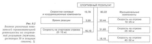 цессов, быстротой передачи нервных импульсов, скоростью мышечного сокращения. Скорость на стартовом отрезке — 0—Юм — зависит от взрывной силы мышц нижних конечностей, своевременности и мощности отталкивания от тумбы, рационального угла вылета тела, его положения в полете, утла входа в воду и, что очень важно, от положения различных частей тела при скольжении, своевременности перехода от скольжения к циклической работе, структуры и мощности первых рабочих движений. Скорость на отрезке 10 —25 м, в первую очередь, определяется мощностью рабочих движений, мощностью и емкостью алактатного анаэробного энергообеспечения. На отрезке 25 — 42,5 м, наряду с емкостью анаэробного алактатного процесса, решающее значение приобретает подвижность и мощность глико-литического анаэробного энергообеспечения. В табл. 9.3 представлены характеристики соревновательной деятельности высококвалифицированных пловцов, специализирующихся на дистанции 50 м вольным стилем, которые свидетельствуют о достаточно больших колебаниях индивидуальных значений. Дистанция 100 м. Роль различных скоростно-силовых, координационных и функциональных компонентов для достижения конечного результата варьирует в широком диапазоне — от 1,7 до 18,18% — и пропорциональна времени выпол-