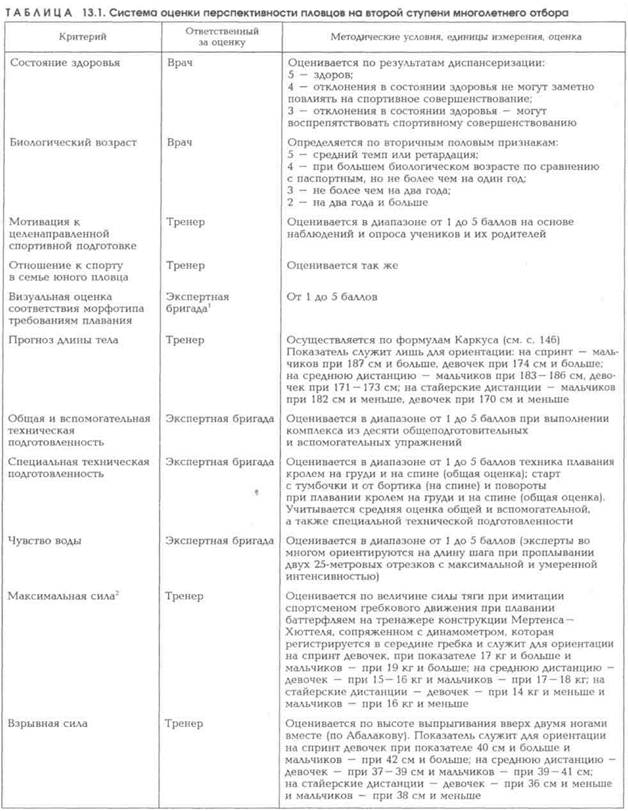Основной задачей третьей ступени многолетнего отбора пловцов сопутствующей этапу их специализированной базовой подготовки является определение перспектив достижения ими высокого мастерства в конкретных дисциплинах плавания, что определяет возрастающую взаимосвязь на этом этапе оценки перспективности ориентации пловцов на ту или иную специализацию. В частности, обоснованно ориентировать на ту или иную специализацию помогут типичные для пловцов различных специализаций профильные контуры (рис. 13.6), контуры и поперечные сечения тела (рис. 13.7), его обхватные размеры (табл. 13.2), состав (рис. 13.8), а также рельеф мускулатуры (рис. 13.9, 10). Однако обоснованная ориентация пловцов на ту или иную дистанцию на рассматриваемом этапе должна уже базироваться не только на показателях его морфотипа. И четкое понимание этого предопределило проведение специальных исследований (Булатова, 1999), итоги которых позволили разделить пловцов в зависимости от их мор-фофункциональной и психофизиологической предрасположенности к различным соревновательным дистанциям на пять основных групп (табл. 13.3). Как видим, чисто спринтерский или стайерский типы встречаются довольно редко, большинство спортсменов относятся к различным промежуточным типам. Пловцы каждой группы существенно различаются по антропометрическим
