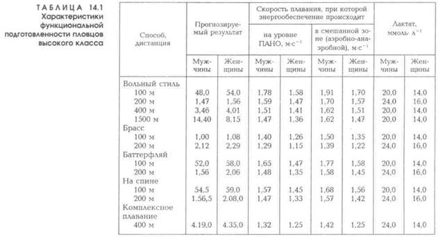 глава14 14.1. ОСНОВНОЙ ОТБОР И ОРИЕНТАЦИЯ ПЛОВЦОВ НА ЭТАПЕ МАКСИМАЛЬНОЙ РЕАЛИЗАЦИИ ИНДИВИДУАЛЬНЫХ ВОЗМОЖНОСТЕЙ Предшествующая этапу максимальной реализации индивидуальных возможностей четвертая ступень отбора и ориентации пловцов призвана определить вероятность достижения ими высот мастерства. В этот период предполагается выявить у них соответствующую мотивацию, определить уровень психологической надежности, эффективность соревновательной деятельности, уровень специальной подготовленности, наличие или отсутствие заболеваний и травм, а также соответствие становления мастерства пловцов характерному для сильнейших в мире представителей их специализации. При этом оценка мотивации к достижению высокого мастерства осуществляется с учетом всех факторов, способных на нее существенно повлиять, — возраста спортсмена и особенностей его подготовки, состояния здоровья и адаптационных резервов организма, отношения к спорту в семье спортсмена и его взаимоотношений с тренером и товарищами по спорту, его образовательного уровня и соответствующих притязаний и перспектив и др. Оценка состояния здоровья пловца предполагает углубленное комплексное медико-биологическое обследование, призванное выявить даже не то чтобы наличие препятствующих достижению высот мастерства отклонений в состоянии здоровья, но и вероятность риска их появления, всесторонне оценить «биологическую надежность» пловца в условиях резко возрастающей на этапе подготовки к высшим достижениям напряженности подготовки. Основным критерием психологической надежности пловца на четвертой ступени отбора и ориентации, является демонстрация им лучших результатов в самых ответственных соревнованиях, в финальных, а не в предварительных заплывах. Оценка эффективности соревновательной деятельности пловца предполагает дифференцированный контроль ее всех основных компонентов — участков дистанционного плавания, старта, поворотов; оценка специальной физической подготовленности — использование широкого комплекса хорошо обоснованных и информативных тестов и показателей, в том числе и функциональной подготовленности пловцов высокого класса (табл. 14.1). При оценке специальной технической подготовленности основное внимание уделяется результативности техники при учете ее эффективности, стабильности, вариативности и других основных характеристик, а также используются современные методики регистрации кинематических, динамических и ритмических характеристик движений.