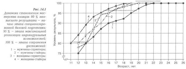 При оценке соответствия становления мастерства пловца характерному для сильнейших представителей его специализации могут быть использованы модели формирования высшего мастерства разного типа (рис. 14.1). Подобные модели не только обеспечивают принципиальные ориентиры для рационального построения многолетней подготовки спортсменов, но и критерий оценки их перспективности. Например, с учетом модельного уровня мастерства для мужчин, специализирующихся на дистанции 100 м вольным стилем, перспективу достижения высших результатов имеет тот, кто в 18-летнем возрасте показывает результат не хуже чем 51,6с (93% мирового рекорда). Оценивая перспективы выступления на Играх Олимпиады или чемпионате мира представителей соответствующей специализации, следует учитывать предполагаемый результат призе-