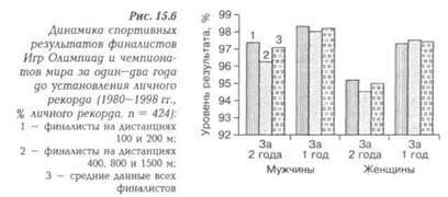 единицы подобных примеров у мужчин. Продолжительность этапа максимальной реализации индивидуальных возможностей у стайеров меньше, чем у спринтеров (см. табл. 15.1) Стайеры достигают примерно равного со спринтерами уровня мастерства, будучи на год моложе (см. рис. 15.5), и быстрее продвигаются к своей вершине, что отражает и более "резкая" у них динамика становления высшего мастерства (см. рис. 15.6) и меньшее их представительство в числе сильнейших в мире в предшествующие Играм годы (см. рис. 15.7). И естественно, значительно больше примеров стремительного становления мастерства пловцов, специализирующихся на дистанциях 400 и, в особенности 8t)0 и 1500 м, по сравнению с теми, кто специализируется на 50, 100 и 200 м. Нельзя, однако, не заметить, что во второй половине 80-х и в 90-е годы отличия в темпе формирования высшего мастерства пловцов разного пола и различных специализаций заметно уменьшились, что наиболее емко отражает уменьшение в последние годы разницы возраста финалистов крупнейших соревнований в различных дисциплинах плавания и, в частности, на спринтерских и стайерских дистанциях. Достаточно сказать, что Сальников был самым старшим победителем Игр 1988 г. Все это объяснимо существенным возрастанием роли силового компонента в структуре подготовленности пловцов, в том числе и специализирующихся на длинные дистанции, совершенствованием системы их многолетней подготовки и, не в последнюю очередь, -коммерциализацией спорта, побуждающей более длительно, чем прежде, преодолевать тяготы даже особенно напряженной тренировочной работы, характерной для стайеров. Наибольшая продолжительность этапа максимальной реализации индивидуальных возможностей у мужчин, специализирующихся в вольном стиле на коротких дистанциях. Представители этой специализации обычно "крадутся" к своей вершине, что иллюстрирует спортивный путь девятикратного олимпийского чемпиона (1968 и 1972 гг.) Марка Спитца, восьмикратного олимпийского чемпиона (1984-1992 гг.) Мэтью Бионди и четырехкратного олимпийского