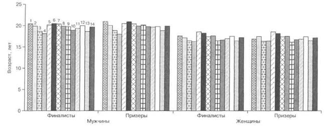 Возраст пловцов-финалистов и призеров крупнейших соревнований 70-х - 90-х гг.: 1 - 100 м вольный стиль; 2 — 200 м вольный стиль; 3 - 400 м вольный стиль; 4 - 800, 1500 м вольный стиль; 5 - 100 м брасс; 6 - 200 м брасс; 7 — 100 м баттерфляй; 8 - 200 м баттерфляй; 9 — 100 м на спине; 10 — 200 м на спине; 11 — 400 м комплексное плавание; 12 — дистанции 100, 200 м; 13 - дистанции 400, 800, 1500 м; 14 — все дистанции чемпиона Александра Попова (1992—1996). Наименьшая продолжительность рассматриваемого этапа и наибольший темп формирования высшего мастерства у женщин, специализирующихся в вольном стиле на длинных дистанциях. Для них типичен стремительный "взлет", что, например, ярко иллюстрирует спортивный путь четырехкратной олимпийской чемпионки Джаннет Эванс. Следует заметить, что темпы формирования высшего мастерства обусловлены не только специализацией и полом пловца, но и, в опре- деленной мере, характером его подготовки на предшествующих этапах спортивного совершенствования. Стремительным он был у многократных олимпийских чемпионов Бионди и Эванс, а также других выдающихся пловцов, чья начальная подготовка носила многоборный характер, а базовая была достаточно разносторонней. Обусловленные специализацией и полом пловцов отличия темпа формирования их мастерства наиболее емко проявляются в возрасте достижения ими наивысших результатов (рис. 15.8—15.10, табл. 15.3).