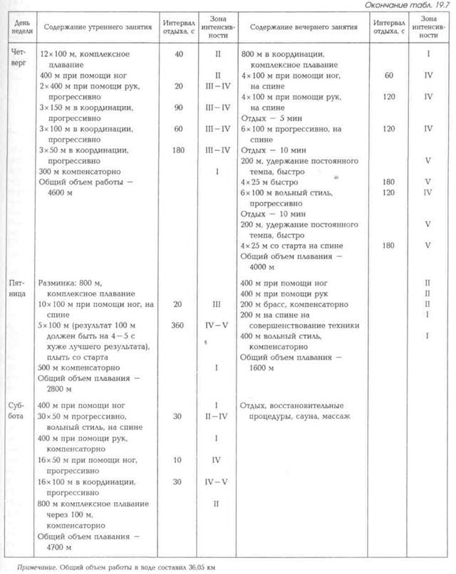 упражнения, включаемые во второе и третье занятия. Достаточно сказать, что современные мастера плавания тренируются 2 — 3 раза в день, затрачивая на работу в воде до 5 — 7 ч ежедневно, а раньше, при одноразовых ежедневных занятиях, продолжительность тренировки не превышала 2 —2,5 ч. За счет увеличения количества занятий в течение дня дневной объем плавания у многих сильнейших пловцов достиг 18 — 20 км, а годовой — 2500 — 3500 км, в то время как 30 — 35 лет назад, когда количество занятий в течение недельного микроцикла у квалифицированных пловцов обычно не превышало 6 — 9, объем плавания был в 3 — 4 раза меньше. Вместе с тем, эффективность 2 —3-разовых занятий в течение дня высока лишь в тех случаях, когда рационально сочетаются нагрузки основных и дополнительных занятий и увеличение общего количества занятий не сопровождается уменьшением количества занятий с большими нагрузками, которые служат мощным стимулом роста тренированности. При трех занятиях в течение дня, два проводятся в воде, а одно — на суше. Утром, как правило, проводится занятие в воде, днем — на суше, вечером — опять в воде. Такой режим широко распространен в подготовке пловцов высокого класса при централизованной ее организации в плавательных центрах, школах-интернатах спортивного профиля, на различных сборах. В этом случае построение микроциклов еще больше усложняется. Особенно важно правильно определить направленность занятий на суше, с тем чтобы программа утреннего занятия в воде отрицательно не сказывалась на качестве работы на суше, а последняя, в свою очередь, не противоречила направленности последующего занятия в воде. В табл. 19.5 представлены целесообразные сочетания занятий в воде и на суше при трех занятиях в течение дня. ГЛАВА 19 Построение программ микроциклов Структура микроциклов в значительной мере определяется периодом макроцикла. В зависимости от преимущественных задач того или иного периода существенно варьируют основные характеристики программ микроциклов: общий объем работы на суше и в воде, количество занятий, соревновательных стартов и т.д. 19.3. ПОСТРОЕНИЕ ВОССТАНОВИТЕЛЬНЫХ И ПОДВОДЯЩИХ МИКРОЦИКЛОВ Восстановительными микроциклами обычно завершается серия ударных микроциклов. Они применяются и после напряженной соревновательной деятельности. Их основная роль сводится к обеспечению оптимальных условий для восстановительных и адаптационных процессов в организме спортсмена, что обусловливает невысокую суммарную нагрузку и широкое использование в них средств активного отдыха. В табл. 19.6 представлены наиболее общие характеристики недельных восстановительных микроциклов, применяющихся пловцами высокой квалификации. Как видно, суммарный объем работы в часах меньше чем в ударных микроциклах примерно в два раза, в то время как объем плавания меньше в 3 — 4. Значительно меньше и общее количество занятий на суше и в воде, а занятия с большими и значительными нагрузками вообще не планируются. Подводящие микроциклы направлены на непосредственное подведение пловца к соревнованиям. Их содержание может быть весьма разнообразным и зависит от системы подведения спортсмена к соревнованиям, и его индивидуальных особенностей. В зависимости от этого в подводящих микроциклах могут воспроизводиться режим предстоящих соревнований, решаться вопросы 