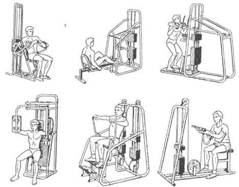 Разнообразие средств традиционной динамической силовой тренировки обеспечивает всестороннее воздействие на мышечный аппарат, позволяет обеспечить сопряженное совершенствование силовых качеств и основных элементов технического мастерства. Сочетание преодолевающего и уступающего режимов работы мышц создает условия для выполнения движений с достаточно большой амплитудой, что является положительным фактором для проявления и развития силовых качеств. Путем рационального подбора упражнений (например, использования узконаправленных упражнений с ограниченной амплитудой движений) можно в определенной мере компенсировать недостатки данного режима, связанные с уменьшением нагрузки на мышцы, вызванным инертностью при ско-ростно-силовой работе. Таким же путем можно обеспечить нагрузку на мышцы, адекватную их возможностям в той или иной фазе. Простота и доступность силовой тренировки в этом режиме при достаточно высокой эффективности обусловливают существенный объем силовой работы традиционного динамического характера при подготовке квалифицированных пловцов. Тренировка в таком режиме в основном используется для решения задач общей физической подготовки, связанных с созданием силового фундамента, и, в первую очередь, с развитием максимальной силы. За счет использования тренажеров, предполагающих различные варианты обеспечения сопротивления — грузы, рычаги, тренировка йожет быть очень разнообразной (рис. 20.2). При развитии максимальной силы работа выполняется с большими отягощениями (75 — 80 % максимума) при небольшом количестве повторений (6 —8 в одном подходе), в медленном темпе (на преодолевающую часть работы затрачивается 1—2 с, на уступающую — 2 —4 с). Темп движений и продолжительность пауз могут варьироваться: