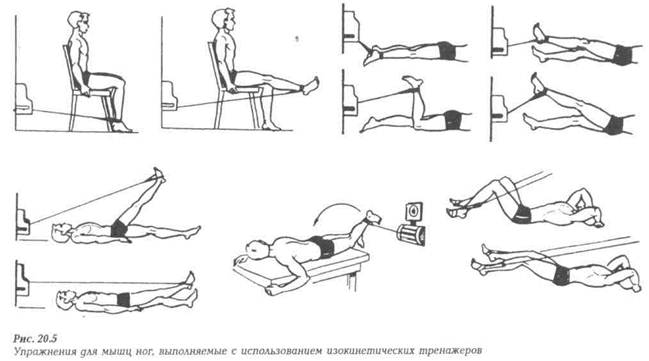 Рис. 20.6 Изотнетичесте тренажеры, сконструированные для специальной силовой подготовки пловцов Однако здесь существует объективное противоречие: стремление выполнить 6 — 8 повторений в подходе вынуждает спортсмена выполнять упражнения с отягощениями, масса которых значительно меньше доступных при одном повторении. Изокинетические упражнения снимают это противоречие, так как позволяют в каждом повторении добиться максимальных проявлений силы, т. е. изоки-нетический режим увязывает силовые проявления с реальными возможностями не только в различных фазах движения, но и в различных повторениях отдельного подхода. Благодаря особенностям изоки-нетического режима сопротивление можно варьировать в широком диапазоне, приспосабливаясь к реальным возможностям мышц в каждой фазе выполняемого движения. Следует учитывать и тот факт, что при работе в других режимах скорость перемещения биозвеньев обычно не может превышать 45 — 60 граде-1, в то время как в естественных движениях, характерных для различных компонентов соревновательной деятельности в плавании, часто оказывается значительно выше. Это исключительно важно, так как экспериментальные работы, проведенные в данном направлении, свидетельствуют о строгой специфичности силовой тренировки. Силовые упражнения в изокинетическом режиме, выполняемые на современных тренажерах, позволяют варьировать скорость перемещения биозвеньев до 250 граде-1 и более. Силовая тренировка пловцов, основанная на выполнении упражнений изокинетического характера с высокой угловой скоростью (более 100 град-с-1), оказывается более эффективной по сравнению с аналогичной по объему и продолжительности тренировкой, основанной на выполнении упражнений в изотоническом режиме или изокинетическом режиме с низкой ско- ростью перемещения биозвеньев (20-30 град-с-1). (Wilmore, Costill, 1994; Platonov, 1995). Рассматривая преимущества высокоскоростной изокинетической тренировки, следует отметить, достаточно высокое ее соответствие специфическим требованиям спортивного плавания по сравнению с другими методами. Если силовая программа выполняется на специальных тренажерах, позволяющих имитировать рабочие движения, характерные для плавания, то силовая тренировка прямо (без периода «адаптации» силовых качеств к специфике плавания путем применения упражнений в воде) приводит к приросту спортивных результатов. В случае применения других режимов этого, как правило, достичь не удается. Все это предопределило исключительно быстрое распространение силовой тренировки в данном режиме в 70-х гг. и достаточно широкое ее применение в последующие годы, несмотря на появление новых тренажерных устройств, позволяющих, в частности, обеспечить работу в режиме переменных сопротивлений. Некоторые выдающиеся пловцы (М. Гросс, Б. Баррон, П. Моралес, С. Грегг, Б. Митчел, М. Мигер, Ж. Эванс, К. Отто, X. Фридрих, 3. Хернер, У. Дасслер, В. Сальников) большую часть объема работы на суше выполняли в изокинетическом режиме, используя различные варианты специальных тренажеров (рис 20.6). Метод переменных сопротивлений. Выделение этого метода прямо связано с использованием различных тренажеров, конструктивные особенности которых позволяют изменять величину отягощений в разных частях движения с учетом реальных возможностей вовлеченных в работу мышц. В практ