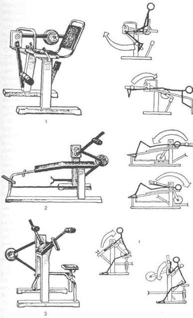 Рис. 20.9 Тренажеры с изменяющимся сопротивлением фирмы "Schnell": 1 - для сгибания и разгибания ног в коленном суставе, 2 - для сгибания и разгибания рук, 3 - для движений в локтевом суставе (на схемах представлены направления движений, ширина стрелок отражает динамику сопротивлений) ют выполнение упражнений с очень большой амплитудой и, таким образом, обеспечивают в уступающей части работы максимальное растяжение работающих мышц. Это важно по двум причинам: во-первых, предварительно хорошо растянутые мышцы способны к более высокому проявлению силовых качеств; во-вторых, создаются хорошие предпосылки для од- новременного проявления силовых качеств и гибкости, «проработки» мышц с большей амплитудой движений (Gambetta, 1987; Bosko, 1985; Platonov, Fesenko, 1994). Обеспечить большую амплитуду движений можно и за счет рационального подбора традиционных упражнений. Например, только за счет изменения ширины хвата при подтягивании на перекладине или жиме штанги можно значительно увеличивать амплитуду движений в плечевом суставе. Однако даже при рациональном подборе упражнений амплитуда движений, как правило, далека от предельной. В то же время конструктивные особенности каждой из многочисленных конструкций тренажеров «Наутилус» способствуют обеспечению максимальной амплитуды движений как основы для максимального развития силовых качеств и совмещенного развития силы и гибкости. Особенно широко такие тренажеры представлены в спортивных залах плавательных центров США. Силовая подготовка с их использованием занимала ведущее место при подготовке многих известных спортсменов. В последние годы в подготовке европейских пловцов получили распространение тренажеры фирмы "Schnell", которые обеспечивают такие же условия для работы мышц, как и тренажеры «Наутилус», но конструктивно намного проще и дешевле (рис. 20.9). Применение рычагов и специальных синхронизирующих устройств позволяет обеспечить различную динамику сопротивлений в зависимости от биомеханической структуры конкретного упражнения. В зависимости от методики планирования основных компонентов нагрузки тренировка в режиме переменных сопротивлений может быть направлена на развитие различных видов силовых качеств: максимальной силы, взрывной силы, силовой выносливости.