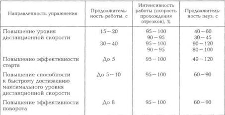 30 с не наблюдается падения работоспособности вследствие прогрессирующего утомления. При планировании интенсивности работы или скорости преодоления отрезков и дистанций следует исходить из того, что тренировочная работа должна оказывать на организм спортсмена воздействие, стимулирующее приспособительные изменения, лежащие в основе проявления свойств, которые в сумме определяют уровень скоростных возможностей. Этому способствует высокая, вплоть до максимальной, интенсивность упражнений. При выполнении скоростных упражнений спортсмен должен стремиться обеспечить максимальный уровень проявления скорости за счет предельной мобилизации сил и соответствующих его морфологическим особенностям частоты и амплитуды движений. Скоростная подготовка не может быть ограничена скоростными упражнениями с максимальным и близким к нему уровнем интенсивности. Совершенствованию различных скоростных способностей и их составляющих помогают упражнения, выполняемые с интенсивностью 85 — 95 % максимально доступной. И именно широкая вариативность интенсивности работы при выполнении отдельных упражнений со значительным использованием средств, требующих предель- ной мобилизации скоростных качеств, является одним из непременных условий планомерного повышения скоростных возможностей пловцов. При развитии скоростных способностей продолжительность пауз планируется так, чтобы к началу очередного упражнения возбудимость центральной нервной системы была повышена, а физико-химические сдвиги в организме уже в значительной мере нейтрализованы. В табл. 21.3 приведены примерные интервалы отдыха, соответствующие этой задаче и рекомендуемые для использования в тренировке квалифицированных пловцов. Если паузы будут короче, то в организме спортсмена произойдет относительно быстрое накопление продуктов распада, что приведет к снижению работоспособности при выполнении последующих упражнений. Дальнейшее продолжение работы при выполнении этих условиях будет в большей мере повышать анаэробную (гликолитическую) производительность, чем совершенствовать скоростные возможности. Многократное выполнение скоростных упражнений с высокой интенсивностью даже при оптимальных паузах вызывает кумуляцию физико-химических сдвигов и снижение психической готовности к выполнению высокоинтенсивной работы. Увеличению объема работы,