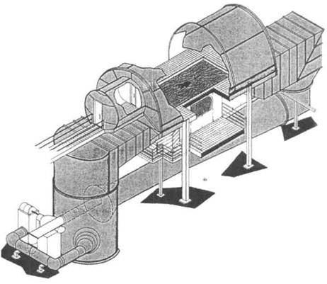 Рис. 22.7 Барокамера с гидродинамическим бассейном (схема), функционирующая на олимпийской базе подготовки пловцов США в Колорадо Спринте тической системы может быть непрерывным и серийным. Хорошо тренированные пловцы могут проплывать в занятии до 20 — 30 отрезков по 50 м, 10 — 20 по 100 м. Однако с увеличением* объема выполняемой работы гликолитический путь ресинтеза АТФ постепенно сменяется аэробным и воздействие тренировочного режима приобретает смешанный характер. При серийном планировании упражнений со значительными интервалами отдыха между сериями этого не происходит и работа выполняется преимущественно за счет анаэробных источников энергии. Повышению анаэробных глико-литических возможностей пловцов способствует использование так называемой гипоксической тренировки. В ее основе лежит ухудшение снабжения кислородом работающих тканей. Достигается это различными путями: тренировкой в условиях среднегорья, дыханием через дополнительное «мер- твое» пространство (обычно через трубку длиной 25 —30 см), ограничением актов дыхания при про-плывании отрезков и дистанции и др. (Моногаров, 1994; Булатова, Платонов, 1996). В последние годы в крупнейших центрах подготовки пловцов высокого класса в разных странах (Германия, США) построены специальные барокамеры с гидродинамическими бассейнами (рис. 22.7), позволяющие выполнять специфические нагрузки в различных гипоксических условиях. Тренировка в гипоксических условиях при одних и тех же характеристиках тренировочной работы вызывает значительно более глубокие изменения во внутренней среде организма квалифицированных пловцов (табл. 22.8). В процессе гипоксической тренировки рекомендуется учитывать следующие положения: 1. Тренировка с задержкой дыхания является средством интен-