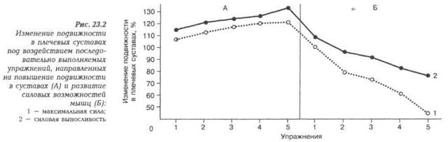 Обратное чередование упражнений, при котором программа, направленная на повышение подвижности в суставах, предшествует силовой, оказывается предпочтительней, так как позволяет добиться большей амплитуды движений при выполнении упражнений, направленных на развитие силовых качеств (рис. 23.2). Чередование упражнений, направленных на развитие силовых качеств и повышение подвижности в суставах (рис. 23.3), помогает обеспечить большую амплитуду движений при выполнении большинства упражнений разного характера, что положительно сказывается на эффективности применяемых тренировочных программ по развитию максимальной силы, силовой выносливости и повышения подвижности в суставах. Выполнение упражнений с таким чередованием вызывает четко выраженное ступенчато-образное изменение подвижности в суставах. Каждое силовое упражнение независимо от направленности приводит к уменьшению подвижности по сравнению с результатами предыдущего измерения: каждое упражнение, направленное на повышение подвижности в суставах, связано со значительным увеличе-