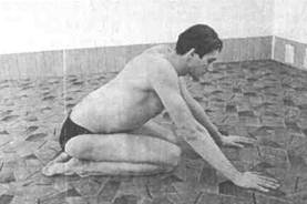 Рис. 29.2 Упражнение для растягивания широчайшей мышцы спины ют увеличить длину мышц, что снижает нагрузку на сухожилия, а после занятия, повышая кровоснабжение мышц, способствуют выведению продуктов метаболизма и предотвращению мышечных спазмов и тугоподвижности. Рекомендуются статические упражнения на растягивание с удержанием и исключаются упражнения баллистического типа. Эффективны упражнения на растягивание с партнером, однако они требуют осторожности, чтобы не допустить перерастягивания. Для пловцов очень эффективны упражнения на растягивание мышц передней части плеча. Упражнение, показанное на рис. 29.1, особенно эффективно для специализирующихся в кроле на груди и брассе. Спортсмен одной рукой упирается в стенку и медленно от нее отворачивает голову в сторону противоположного плеча и в крайне доступном положении удерживается до 25 с. Следующее упражнение (рис. 29.2) для растягивания широчайшей мышцы спины эффективно для специализирующихся в брассе, кроле на груди и особенно в кроле на спине. Опустившись на колени, спортсмен вытягивает руки перед собой и, сохраняя их выпрямленными, «потягивается» назад. Движение выполняется очень медленно с удержанием на 25 с в крайнем положении.