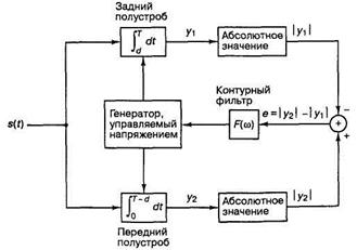 Основным недостатком разомкнутых символьных синхронизаторов является наличие неустранимой ошибки сопровождения с ненулевым средним. Эту ошибку можно снизить при больших отношениях сигнал/шум, но поскольку форма сигнала синхронизации зависит непосредственно от поступающего сигнала, устранить ошибку не удастся никогда. Замкнутые символьные синхронизаторы сравнивают входной сигнал с локально генерируемым с последующей синхронизацией локального сигнала с переходами во входном сигнале. По сути, процедура ничем не отличается от используемой в разомкнутых синхронизаторах. Среди наиболее популярных замкнутых символьных синхронизаторов можно выделить синхронизатор с опережающим и запаздывающим стробированием" (early/late-gate synchronizer). Пример такого синхронизатора схематически изображен на рис. 4. Его работа заключается в выполнении двух отдельных интегрирований энергии входного сигнала по двум различным промежуткам символьного интервала длительностью (Т-d) секунд. Первое интегрирование (опережающее) начинается в момент, определенный как начало периода передачи символа (условно — момент времени 0), и заканчивается через (T-d) секунд. Второе интегрирование (запаздывающее) начинается с задержкой на d секунд и заканчивается в конце периода передачи символа (условно — момент времени Т). Разность абсолютных значений выходов описанных интеграторов у1 и у2 является мерой ошибки синхронизации символов приемника и может подаваться обратно для последующей коррекции приема.