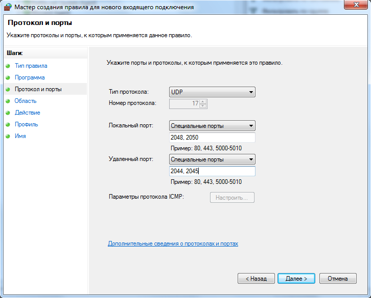 Можно указать, нужно ли применять правило ко всем локальным портам или только к некоторым. Существует возможность выбрать тип протокола, для которого будет выполняться анализ.