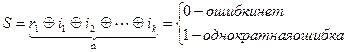 где i - соответствующий информационный символ (0 или 1), k - общее их число, а под операцией "⊕" здесь и далее понимается сложение по mod2. Очевидно, что добавление дополнительного разряда увеличивает общее число возможных комбинаций вдвое по сравнению с числом комбинаций исходного первичного кода, а условие чётности разделяет все комбинации на разрешённые и неразрешённые. Код с проверкой на чётность позволяет обнаруживать одиночную ошибку при приёме кодовой комбинации, так как такая ошибка нарушает условие чётности, переводя разрешённую комбинацию в запрещённую. Критерием правильности принятой комбинации является равенство нулю результата S суммирования по mod 2 всех n символов кода, включая проверочный символ r1. При наличии одиночной ошибки S принимает значение 1: