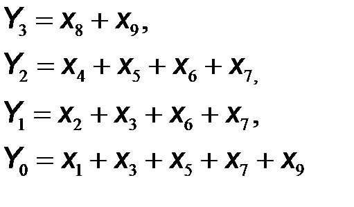 На рис. 9.13 приведена соответствующая логическая схема шифратора из 10 в 4. Таблица 9.3 Таблица истинности шифратора из 10 в 4