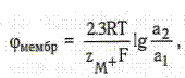 Если мембрана, проницаема, например, только для ионов М+, разделяет два раствора МХ различной концентрации, то часть ионов М+ будет диффундировать через эту мембрану из раствора с большей концентрацией в раствор с меньшей. В результате в первом растворе возникает некоторый избыток отрицательных зарядов, а во втором – положительных. Таким образом, возникает электрохимическая разность потенциалов между растворами, разделенными мембраной, которую наз. мембранным потенциалом (jмембр.). Электрические потенциалы устанавливаются и на клеточных мембранах различного типа. Для отдельного проникающего иона Х разность потенциалов на мембране может быть рассчитана по уравнению Нернста: