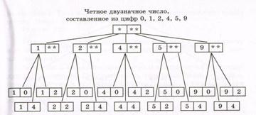 Знакомство с новыми понятиями начнем с двух простых задач. Пример 1. Сколько четных двузначных чисел можно составить из цифр 0, 1, 2, 4, 5, 9? Решение. Составим таблицу: слева от первого столбца поместим первые цифры искомых чисел, а выше первой строки – вторые цифры этих чисел. Так как в двузначном числе на первом месте может стоять любая цифра, кроме 0, то строки будут отмечены цифрами 1, 2, 4, 5, 9. Значит, в нашей таблице будет пять строк. На втором месте в искомом числе должна стоять четная цифра, значит, столбцы будут отмечены цифрами 0, 2, 4. Всего в таблице будет три столбца.