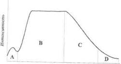 Продолжительность А - разминка (warm up): В - аэробная часть (aerobics) (не менее 15 минут): С - силовая или партерная часть (strength): D - расслабление (заминка) (cool down) ния на большие группы мышц и суставы. Специфическая часть разминки посвящается тем группам мышц и связок, на которые приходится основная нагрузка во время предстоящей тренировки или соревнований. Упражнения, включаемые в разминку должны быть адекватны контингенту занимающихся и предстоящей деятельности в основной части занятия. Разминка строится из не сложных в координационном плане, выполняемых с невысокой амплитудой. Разминку следует начинать, используя "бытовые" движения, встречающиеся в повседневной практике, в которых задействованы большие мышечные группы — обычный шаг, приставные шаги с различными движениями рук, модификации различных шагов, упражнения в стойке ноги врозь со сгибанием и разгибанием ног в коленных суставах и движениями рук (круговые, вытягивания и т.д.). Нет необходимости говорить о дозировке выполнения тех или иных движений, важнее использовать понятие целесообразности длительного применения однотипных движений понижающих интерес занимающихся к занятию. Используя эти упражнения с применением различных средств повышения интенсивности движений, необходимо добиться постепенного повышения температуры мышц, которое визуально проявляется в появлении на лбу легкой испарины через 3-5 минут. При проведении разминки следует применять упражнения низкой ударной нагрузки (Slow-impact). Ощущение теплоты и появление легкой испарины служит сигналом к возможности использования упражнений динамического стретчинга, который более предпочтителен статическому и позволяет сохранять эмоциональный настрой занимающихся двигаясь в темпе музыкального сопровождения. В период выполнения упражнений стретчинга интенсивность разминки несколько снижается, тем не менее, важность использования упражне-