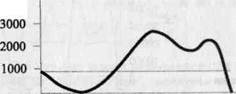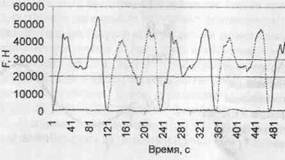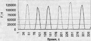 Рис.4 Вертикальная составляющая реакции опоры при прыжке вверх с места жение руки в стороны гораздо легче, чем из положения руки в стороны в положение руки вверх. Выполнять базовые движения в обычной стойке легче, чем в положении полуприседа, как, например, в слайд-аэробике. В этих случаях работают описанные механизмы — увеличение плеча силы или вывод длины мышц за оптимальную длину. Прыгая вверх, т.е., отталкиваясь от опоры, мы воздействуем на нее. Известно, что сила действия равна силе противодействия. Другими словами," с какой силой мы "давим" на опору, с такой силой она "давит" на наши ноги. Эта сила называется "реакцией опоры" и, вместе с силой тяжести, создает дополнительную нагрузку на ОДА человека при выпрыгивании и при приземлении (рис. 4). Существует общее правило: чем сильнее отталкивание (произвольное сокращение мышц), тем больше сила реакции опоры, тем выше прыжок и тем большую нагрузку испытывает костная и мышечная системы при приземлении. Эти силы можно оценить по величине реакции опоры. При приземлении их еще называют ударными нагрузками. На рис. 5-8 показаны силы реакции опоры при выполнении базового движения Скип в варианте Lo, Middle и Hi impact. При переходе от Low к Middle и Hi impact увеличивается реакция опоры при отталкивании и приземлении (амортизации). Кроме того, Hi impact характеризуется наличием безопорной фазы (период полета).