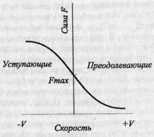 или двумя ногами. В первом случае нагрузка на мышцы будет, разумеется, больше при той же реакции опоры. Величина ударных нагрузок при приземлении пропорциональна высоте подъема ОЦМТ - высоте прыжка. Чем выше прыжок, тем более "жестко" нас встречает опора. Эту "жесткость" могут гасить или костный скелет, если приземление осуществляется на выпрямленные ноги (как при гимнастическом приземлении), или мышечная система, если ноги согнуты в большей степени. Во втором случае плечи и соответственно моменты силы реакции опоры в суставах выше. Это означает, что разгружая костную систему, человек увеличивает силы, растягивающие мышцы. Следует обратить внимание, что величина реакции опоры при приземлении всегда в 2-3 раза выше, чем при отталкивании. В соответствии с этим и нагрузка на ОДА при приземлении также выше. Однако неверно было бы считать, что нагрузка, т.е. интенсивность работы НМА, выше во столько же раз. Соотношения здесь более сложные. Например, на рис. 9 приведена так называемая "кривая Хилла" — зависимость силы, которую может проявить мышца от скорости ее сокращения. Чем выше скорость, тем меньшую силу может развить мышца. Обратим внимание, что на этом графике скорость положительна, когда мышца укорачивается, и отрицательна, когда мышца удлиняется. В соответствии с этим при прыжке, например, различают отрицательную фазу, когда выполняется подсед или приземление, и положительную фазу, когда выполняется отталкивание. Отрицательная фаза называется еще амортизационной фазой, в процессе которой ОДА выполняет свою амортизационную (смягчающую) функцию. В этой фазе мышцы выполняют отрицательную механическую работу, а в фазе отталкивания — положительную. Рис.9 Кривая Хилла