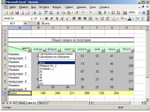 Рисунок- Список с автофильтром По отдельному столбцу в списке критериев отбора предусматриваются следующие варианты: · все — выбираются все записи без ограничений; · первые 10; · значения — будут выбраны только те записи, которые в данном столбце содержат указанное значение; · условие — выбираются записи по формируемому пользователем условию в диалоговом окне «Пользовательский фильтр».