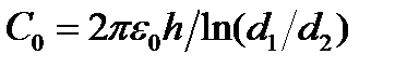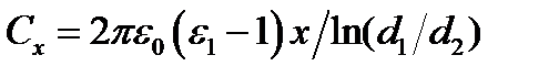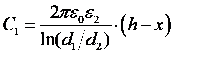 где: e- диэлектрическая постоянная среды; S- площадь обкладок конденсатора; п - число пластин (обкладок); d - расстояние между пластинами. Если поместить конденсатор в топливный бак в качестве датчика, то по мере выработки топлива его емкость будет уменьшаться. Таким образом, чувствительным элементом емкостного топливомера является цилиндрический конденсатор, обкладками которого служат внутренний и внешний металлические цилиндры диаметром d1 и d2 соответственно. Между этими цилиндрами находится слой топлива, уровень которого необходимо измерить (см. рис. 4.5). Определим зависимость емкости конденсатора от уровня топлива x. Если пренебречь толщиной стенок цилиндров, то емкость нижней части датчика, погруженной в топливо:
