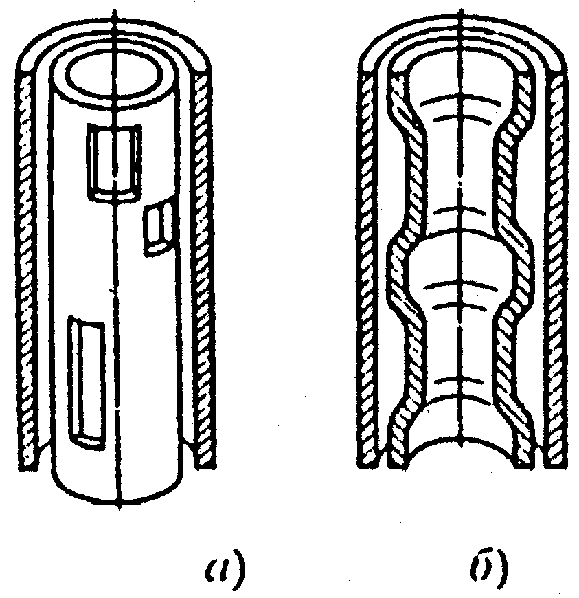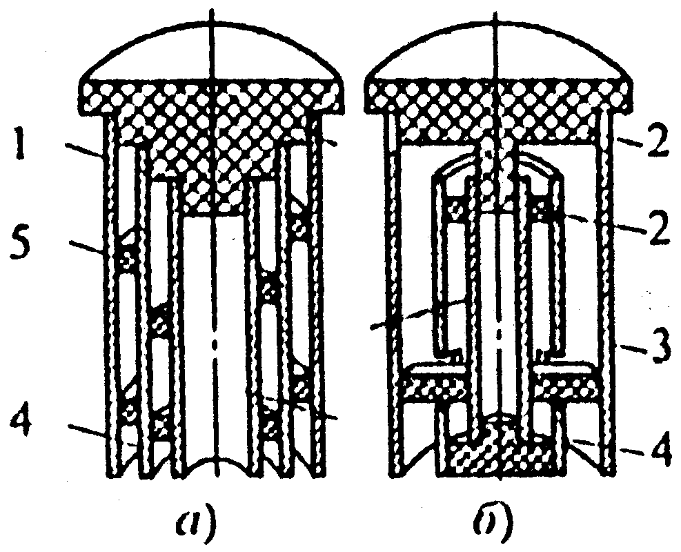 Измерение емкости Сх датчика производится с помощью самоуравновешивающегося моста переменного тока, состоящего из конденсаторов Сх (емкость датчика), С1 (эталонная емкость), резисторов R1 R2 и потенциометра обратной связи Roc (рис. 4.5). При установившемся значении емкости Сх мост уравновешен. При изменении уровня топлива емкость датчика Сх изменится, и в диагонали моста появится напряжение, которое подастся на вход усилителя, а после усиления поступает на управляющие обмотки двигателя М. Двигатель через редуктор перемещает щетку потенциометра Roc уравновешивая мост. Одновременно перемещается стрелка, которая по шкале Q покажет измеренное количество топлива в объемных (литрах) или в массовых (килограммах) единицах. Как при объемной, так и при массовой градуировке шкала указателя будет равномерной лишь в случаях, когда площадь поперечного сечения бака постоянна по его высоте. Если же площадь сечения переменна, то для получения равномерной шкалы, необходимо профилировать емкостные датчики. Для этого в их цилиндрических трубах делают разрезы определенной формы, чтобы емкость датчика была пропорциональна не уровню, а объему топлива (рис. 4.6,б). В других случаях профилирование осуществляется изменением диаметра одном из труб (рис. 4.6,в). Требуемый закон профилирования определяется графическим путем. В зависимости от требуемой начальной емкости и высоты датчика количество труб в нем может быть от 3 до 6. На рис. 4.7 показаны два емкостных датчика различных конструкций. В одной конструкции (рис. 4.7, а) все трубы (1, 3, 4) датчика крепятся к одному изоляционному основанию 2, а для обеспечения зазора (не менее 1,5 мм) между каждой парой труб устанавливаются изоляционные вкладыши 5. В другой конструкции (рис. 4.7, б) электроды 3, 4 конденсатора крепятся с помощью изоляторов 2 к электроду 1. В таком датчике отсутствуют изоляторы между основными (3, 4) электродами и датчик называется трехэлектродным или с разделенными утечками. Емкость между основными электродами обеих датчиков меняется по одним и тем же законам.