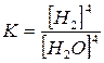 де [А], [В], [С], [D] - рівноважні концентрації реагуючих речовин, моль/л; m, n, p, q- стехіометричні коефіцієнти в рівнянні реакції. Величина K називається константою хімічної рівноваги. Вона залежить від температури і природи реагуючих речовин але не залежить від їхніх концентрацій. Отже, в оборотних реакціях рівновага встановлюється, коли відношення добутку концентрацій продуктів реакції та добутку концентрації вихідних речовин у відповідних ступенях стає рівним деякий сталій величині. Для гомогенної оборотної реакції: H2(г) + I2(г) = 2 НІ(г) константа рівноваги У випадку гетерогенних реакцій концентрації твердих речовин не входять у вираз константи рівноваги. Так, для реакції: 3 Fe(T) + 4 H2O(П) = Fe3O4(T) + 4H2(Г) константа рівноваги
