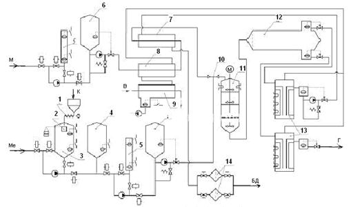 Рис.7.8 – Технологическая схема получения биодизеля в потоке 1 – питатель винтовой, 2 – весовой дозатор, 3 – дозатор-растворитель, 4 – буферная емкость, 5 – объемный зозатор, 6 – фильтр колебаний потока, 7 – теплообменник, 8 – конденсатор-подогреватель, 9 – конденсатор, 10 – инжекционный смеситель, 11 – модуль трансэтерифекации, 12 – сепаратор, 13 – выпарной аппарат, 14 – фильтр-сорбер. М – масло, Ме – метоксид, К – катализатор, Г – глицерин, БД – биодизель, В – вода.