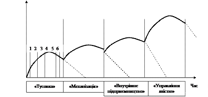 Рис. 24.5. Модель розвитку організації за Є. Ємельяновим та С. Поварніциною Умовні позначки: 1 – формування, 2 – зростання, 3 – стабілізація, 4 – стагнація, 5 – криза, 6 – розпад. Етап 1 Тусовка, де переважають неформальні відносини, общинний менталітет, рівноправність, ідеологічне (харизматичне) лідерство і непрофесійне дружнє або патерналістичне управління. Етап 2 Механізація – це повсюдна формалізація відносин, процесів і процедур. Організація переходить до регулярного менеджменту. Значно поглиблюється поділ праці, складаються докладні посадові інструкції і правила внутрішнього розпорядку. Велике значення надається стандартизації і утилітарності. Нововведення зустрічають істотний опір. Етап 3 Внутрішнє підприємництво – де головним завданням організації, яка фактично являє собою кілька різних бізнесів, стає підвищення ефективності діяльності. Має місце широке делегування повноважень, децентралізація влади, внутрішні підприємницькі ініціативи співробітників і підрозділів, які регулюються детально розробленою політикою і стратегією організації. Найважливішими цінностями стає професіоналізм співробітників, здатність досягти поставленої мети максимально ефективним чином. Часто формуються командні відносини і способи роботи. Етап 4 Управління якістю – де компанія націлюється на захоплення стратегічних пріоритетів на ринку через створення власних стандартів якості. Найвищий рівень виробництва ґрунтується на впровадженні та розвитку ідеології «внутрішнього клієнта», Коли кожний підрозділ компанії стає замовником для одних підрозділів і виконавцем для інших. Проте в цілому технологічний ланцюжок орієнтована на кінцевий результат, працює на клієнта організації. Автори моделі уточнюють, що кожен з цих макроетапов підрозділяється на шість стадій: формування, зростання, стабілізація, стагнація, криза, розпад. Як правило, зміна етапів супроводжується значними трансформаціями всередині організації при спробі вирішити кризу кожного окремого етапу. На закінчення хотілося б особливо відзначити значення тих основ теорії організації та управління, які наводимо. Описані концепції життєвих циклів одні з найпотужніших і найбільш часто використовуваних в реальному житті. Ці моделі є центральними при проведенні організаційної діагностики, так як дійсно здатні дати системне уявлення про організаційні проблеми і відносинах.