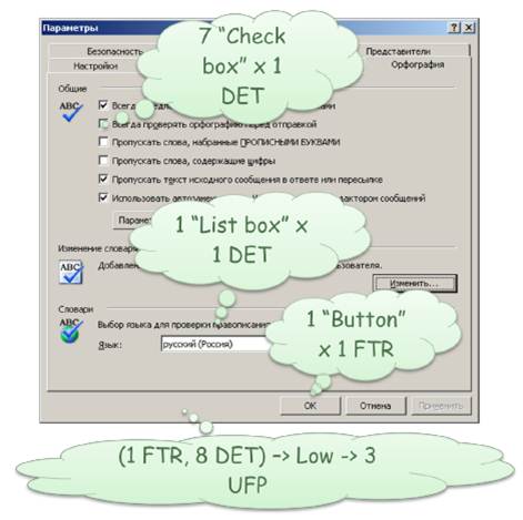 В качестве примера, рассмотрим оценку управляющей транзакции (EI) для диалогового окна, задающего параметры проверки орфографии в MS Office Outlook (Рисунок 40).