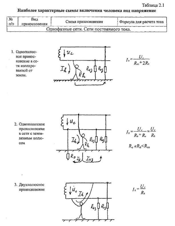 Анализ условий поражения в электроустановках Наиболее характерные варианты (схемы включения) попадания человека под напряжение в сетях переменного и постоянного тока представлены в таблице 2.1, в которой приняты следующие обозначения: - Uс – напряжение сети постоянного или однофазной сети переменного тока; - Uл –линейное напряжение; - Uпр – напряжение прикосновения; - Uш – шаговое напряжение; - Ih – ток через человека; - Iз – ток замыкания на землю; - Rh – сопротивление тела человека; - R0 – сопротивление заземляющего устройства; - Rиз – сопротивление изоляции относительно земли.