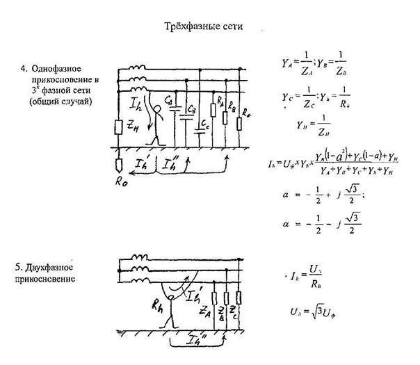 Наиболее типичными являются два случая замыкания цепи тока через тело человека: когда человек касается одновременно 2х проводов и когда он касается лишь одного провода. Двухфазное (двухполюсное) прикосновение (рис. 2.9) более опасно, поскольку к телу человека прикладывается наибольшее в данной сети напряжение. Ток через человека рассчитывается по формуле: