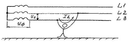 Для 3х фазной сети переменного тока человек попадает под линейное напряжение (Uл)